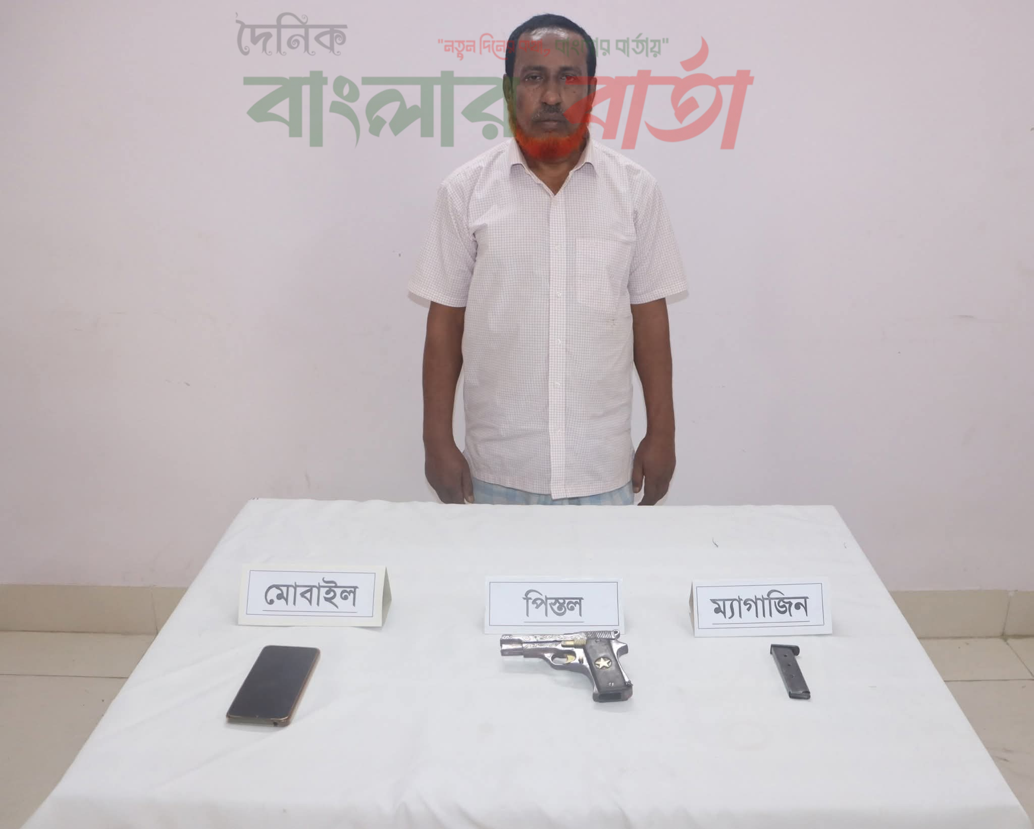 শুক্রবার ভোর ৫টায় অভিযান চালিয়ে তার কাছ থেকে ১টি ৭.৬৫ মিমি. পিস্তল ও একটি খালি ম্যাগাজিন উদ্ধার করা হয়।