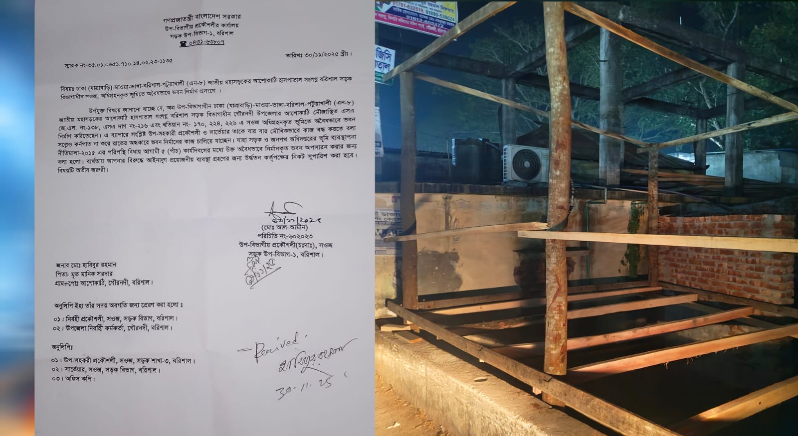 অভিযোগ সূত্রে জানা গেছে, জাতীয় মহাসড়কের আশোকাঠী হাসপাতাল সংলগ্ন বরিশাল সড়ক বিভাগের (সওজ) অধিগ্রহণকৃত ভূমিতে অবৈধভাবে ভবন নির্মাণ করা হচ্ছে। সংশ্লিষ্ট উপ-সহকারী প্রকৌশলী ও সার্ভেয়ার একাধিকবার মৌখিকভাবে কাজ বন্ধের নির্দেশ দিলেও তা উপেক্ষা করে রাতের অন্ধকারে নির্মাণকাজ চালিয়ে যাওয়ার অভিযোগ উঠেছে।