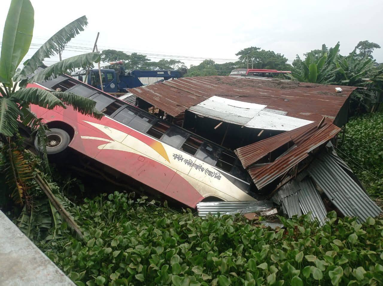 স্থানীয়রা জানান, ঢাকা থেকে ছেড়ে আসা বরিশালগামী শামীম পরিবহনের একটি বাস নিয়ন্ত্রণ হারিয়ে রাস্তার পাশে পরিত্যক্ত দোকান ভেঙে খালে পড়ে যায়। এ সময় বাসের যাত্রীদের চিৎকারে স্থানীয়রা দুর্ঘটনাস্থলে গিয়ে বাসযাত্রীদের উদ্ধার করেন এবং হাইওয়ে পুলিশকে খবর দেওয়া হয়।