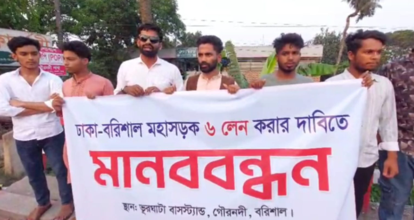 ঢাকা-বরিশাল মহাসড়ক ছয় লেনে উন্নতী করণের দাবিতে মানববন্ধন