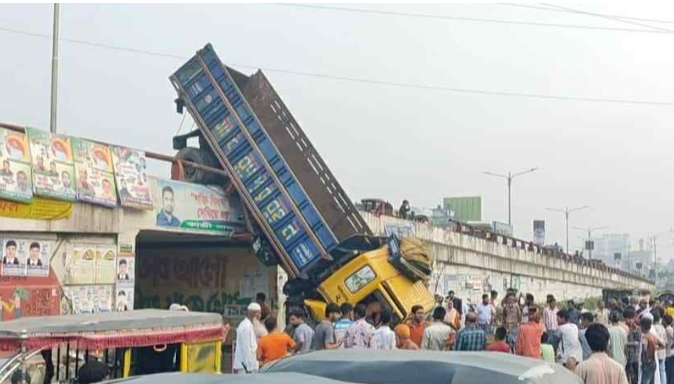 ঢাকা-নারায়ণগঞ্জ লিংক রোডের ভূঁইঘর এলাকায় দ্রুতগামী একটি ট্রাক নিয়ন্ত্রণ হারিয়ে ফ্লাইওভারের রেলিং ভেঙে ঝুলে পড়ে। সোমবার (২৯ সেপ্টেম্বর) দুপুরে এ ঘটনা ঘটে।