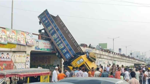 নিয়ন্ত্রণ হারিয়ে ফ্লাইওভারের রেলিং ভেঙে ঝুলে রইল ট্রাক