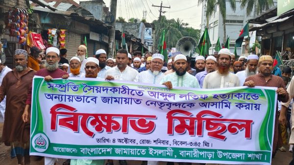 সৈয়দকাঠি ইউনিয়ন কৃষকদল সাধারণ সম্পাদক আব্দুল লতিফ হত্যাকাণ্ডে সুপরিকল্পিতভাবে জামায়াত নেতা, মসজিদের ইমামসহ নিরপরাধ ব্যক্তিদেরকে মামলায় ফাঁসানোর প্রতিবাদে শনিবার বিকেল ৩:৪৫মিনিটে (৪ অক্টোবর) বানারীপাড়ায় বিক্ষোভ মিছিল অনুষ্ঠিত হয়। বানারীপাড়া বন্দরবাজার
