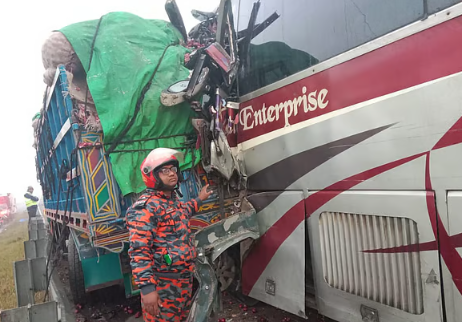 দুর্ঘটনায় বাসের সামনের অংশ দুমড়েমুচড়ে যায়। বাস থেকে যাত্রীদের উদ্ধার করেন ফায়ার সার্ভিসের সদস্যরা। আজ শুক্রবার সকালে মুন্সিগঞ্জের সিরাজদিখানের নিমতলা এলাকায়ছবি: ফায়ার সার্ভিসের সৌজন্যে মুন্সিগঞ্জের সিরাজদিখান উপজেলায় ঢাকা-ভাঙ্গা এক্সপ্রেসওয়েতে থেমে